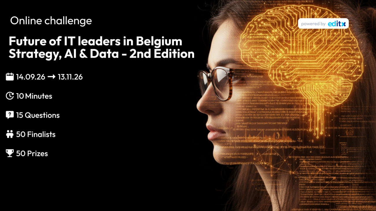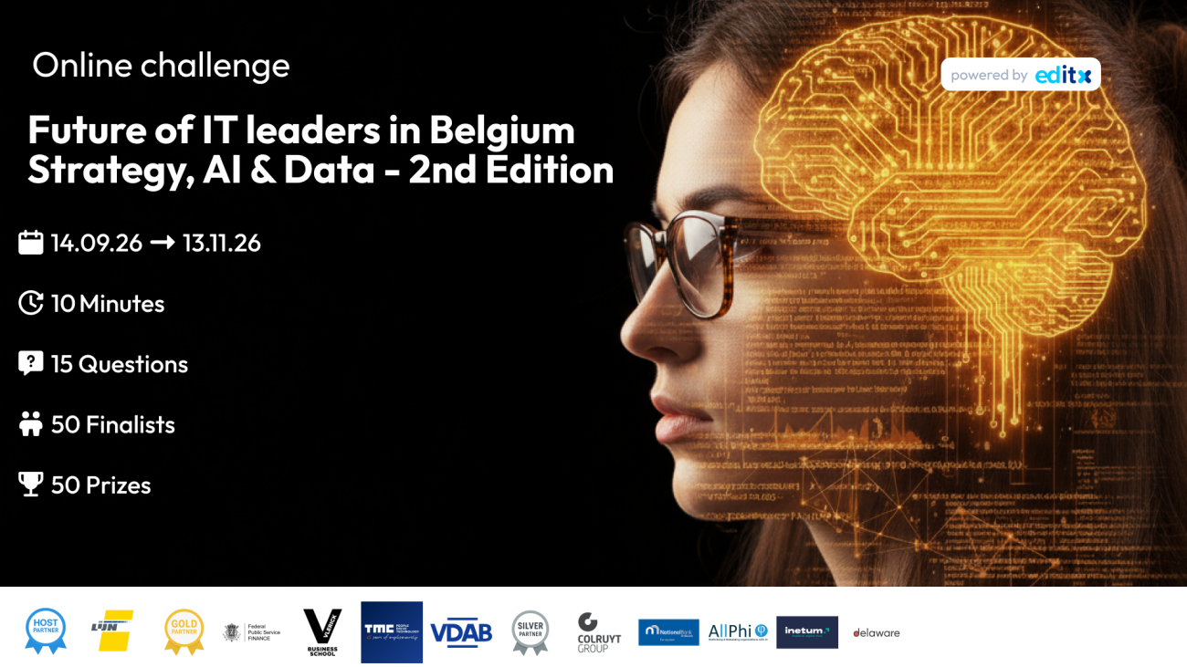 Think you’ve got what it takes to stand out in the Data & AI landscape in Belgium? Here’s your chance to prove it! With this challenge, Editx invites Belgium’s brightest Data and AI enthusiasts to put their core strengths to the test: data intuition 📊, algorithmic thinking 🔢 and applied problem-solving🧩.The challenge unites everyone in the Data & AI ecosystem in Belgium. From established leaders to newcomers and rising talents. So whether you’re driving innovation today or eager to shape it tomorrow, the challenge is the meeting place for everyone passionated and ambitious.Several partners have joined forces to support this challenge 🤝Join the most exciting Data & AI experience in Belgium - where innovation meets fun! 💡🆒 The Challenge:You’ll face 20 questions covering data science, artificial intelligence, machine learning fundamentals, and logical reasoning.But here’s the twist: just 10 minutes and 2 jokers (50/50, Call the Participants) to complete them. Enough time to stay sharp, but not enough to second-guess every move 😉Once you complete the quiz, your score appears instantly.The top 50 participants will advance to the finals on 27/11 in Leuven, hosted by De Lijn ✨You can expect a night of fun, keynotes, networking & awards, in the company of our partners.Prizes to win:🥇 1st place – Free seat for the Vlerick Digital Strategy & AI Programme (value of € 3.995)🥈 2nd place – € 200 Amazon voucher🥉 3rd place – € 100 Amazon voucher🏅 Every other finalist present during the finals: duo Kinepolis cinema tickets💡 Exclusive offer – 10% discount on the Vlerick Digital Strategy & AI Programme for all participants who register with the challenge Digital Strategy and AI | Vlerick Business School - This programme gives you a comprehensive understanding of how digital technology and artificial intelligence can support your strategic priorities. You’ll live and learn the key principles of digital strategy and AI – and gain the knowledge, skills and insights to take the leap into giving your organisation a sustainable, competitive edge. Who can participate?Whether you're a seasoned Data Scientist, a teamleader, an AI Engineer, a Data Analyst, a CIO … or a student passionated about the field, this challenge is made for you 🧑‍🎓 👩‍💻 🧑‍💼No experience required — just your brain, your speed, and your love of Data & AI.Many reasons to join in:Test your Data and AI knowledge in a fun format 🎯Gain visibility among experts and mayor players in the Belgian data community 🌐Be part of a cross-border initiative that values smart, forward-thinking mindsGrow your network and open doors for potential opportunitiesWin prizes and get recognition 🏆 Are you ready?Take the challenge, prove your expertise and let your Data & AI expertise rise to the top 🚀